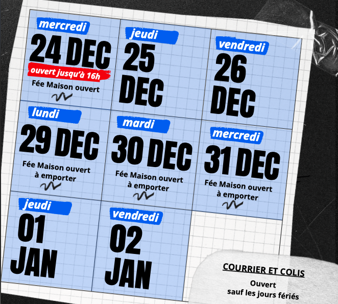 Notre coworking sera fermé du 24 décembre à partir de 16h jusqu’au 02 janvier inclus.
